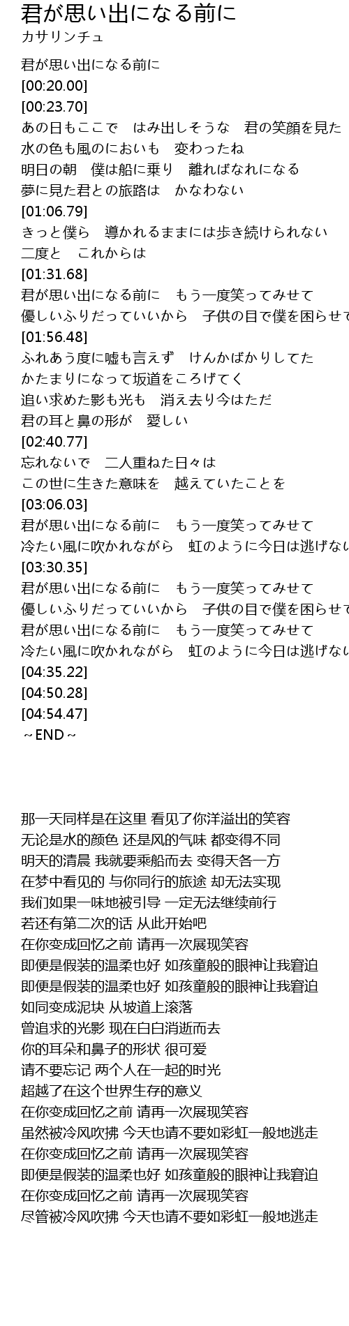 | [03:52.46] | 君が思い出になる前に もう一度笑ってみせて |
