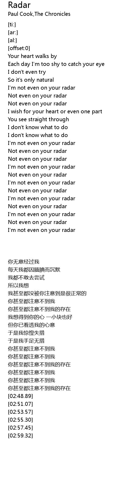 | [00:23.63] | Each day I'm too shy to catch your eye |