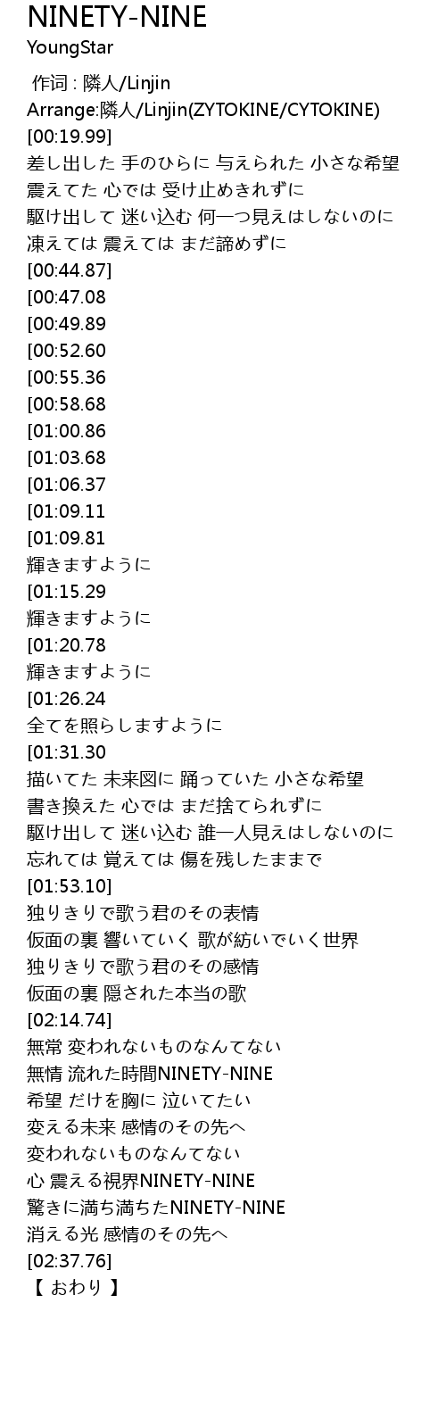 | [03:04.91][01:03.68] | 驚きに満ち満ちたNINETY-NINE |