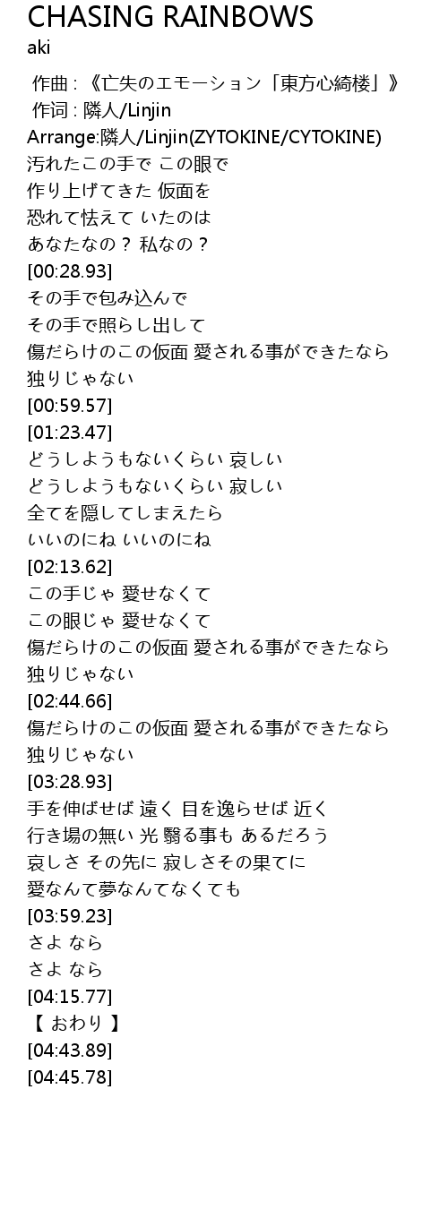 | [00:00.30] | Arrange:隣人/Linjin(ZYTOKINE/CYTOKINE) |