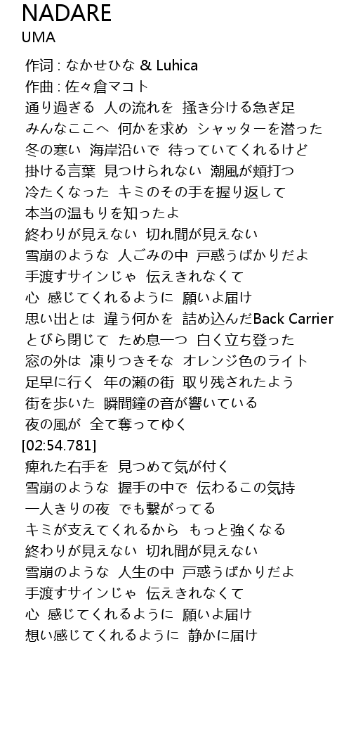 | [01:52.579] | 思い出とは 違う何かを 詰め込んだBack Carrier |