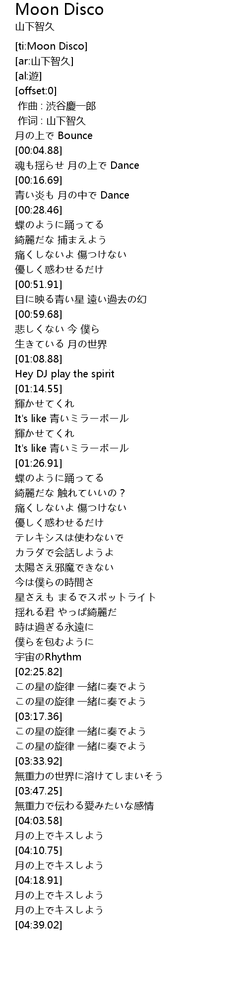 | [00:13.07] | 魂も揺らせ 月の上で Dance |