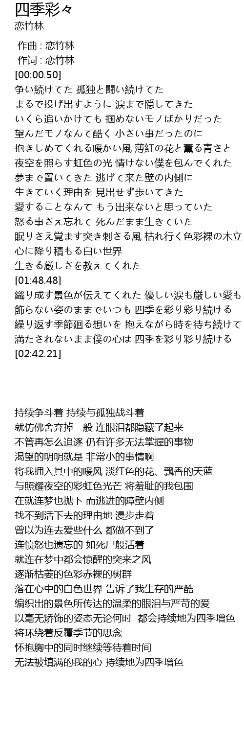 | [02:32.84] | 満たされないまま僕の心は 四季を彩り彩り続ける |