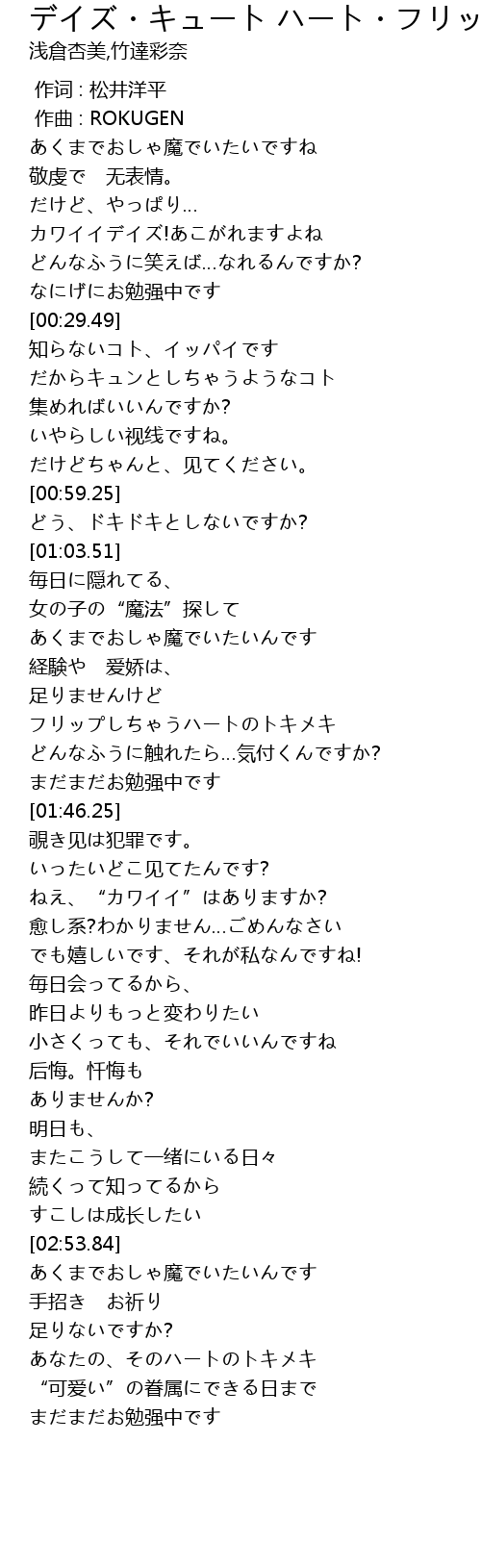 | [01:28.00] | フリップしちゃうハートのトキメキ |