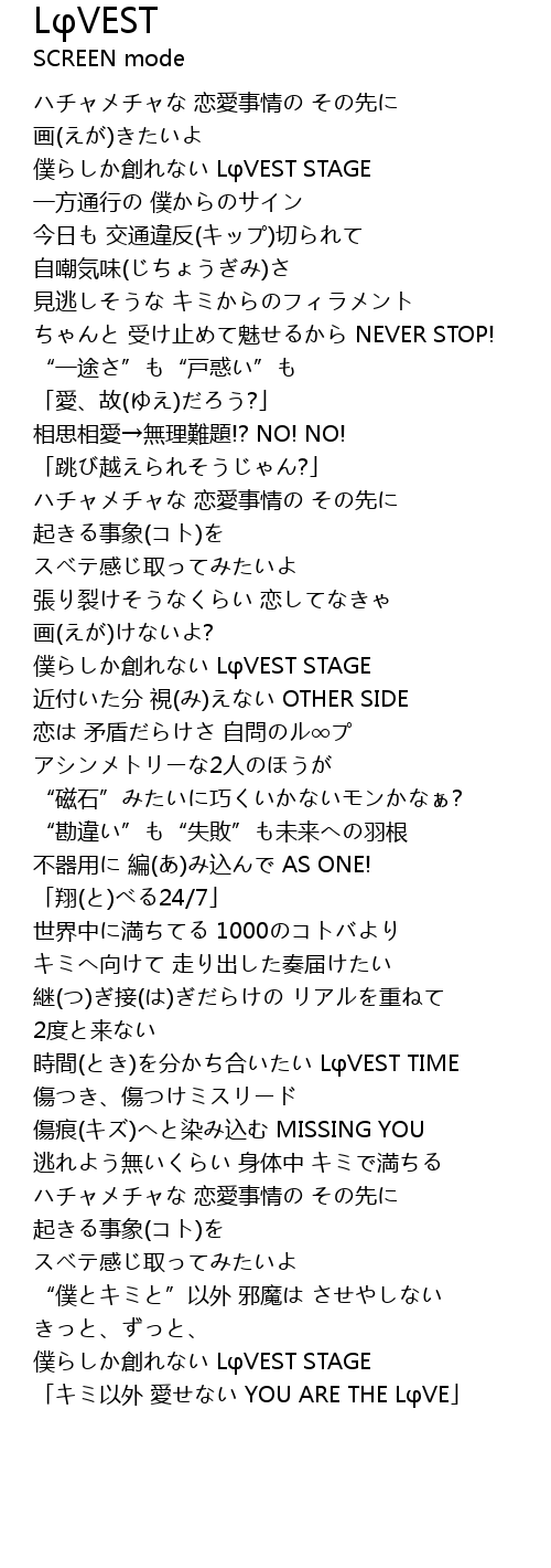 | [00:13.24] | 僕らしか創れない LφVEST STAGE |