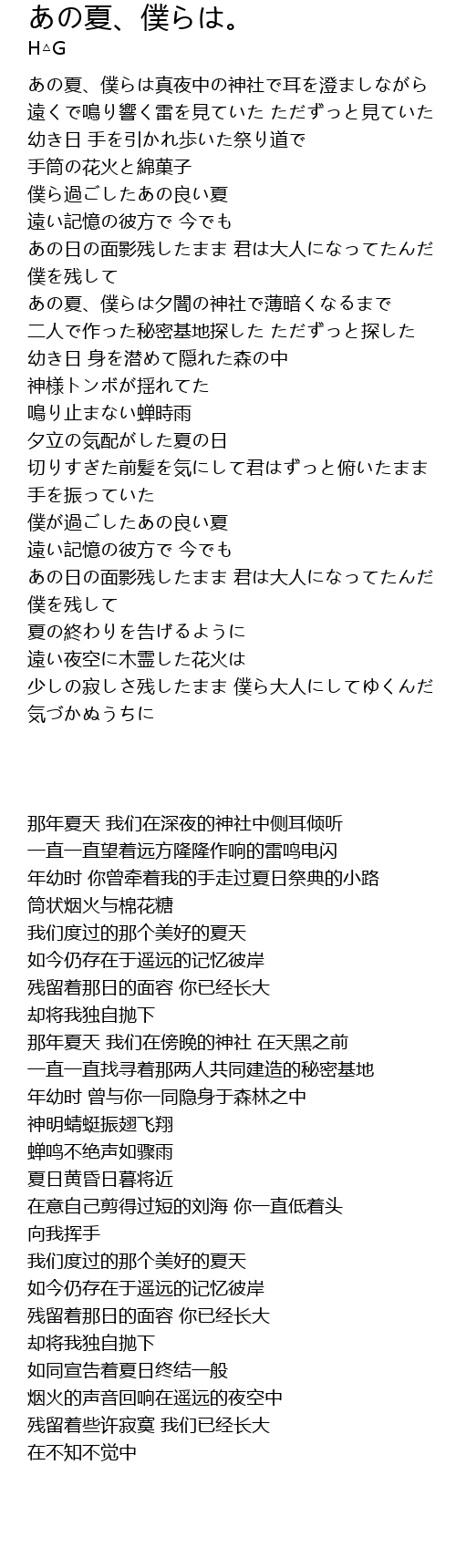 | [00:33.81] | あの夏、僕らは真夜中の神社で耳を澄ましながら |
