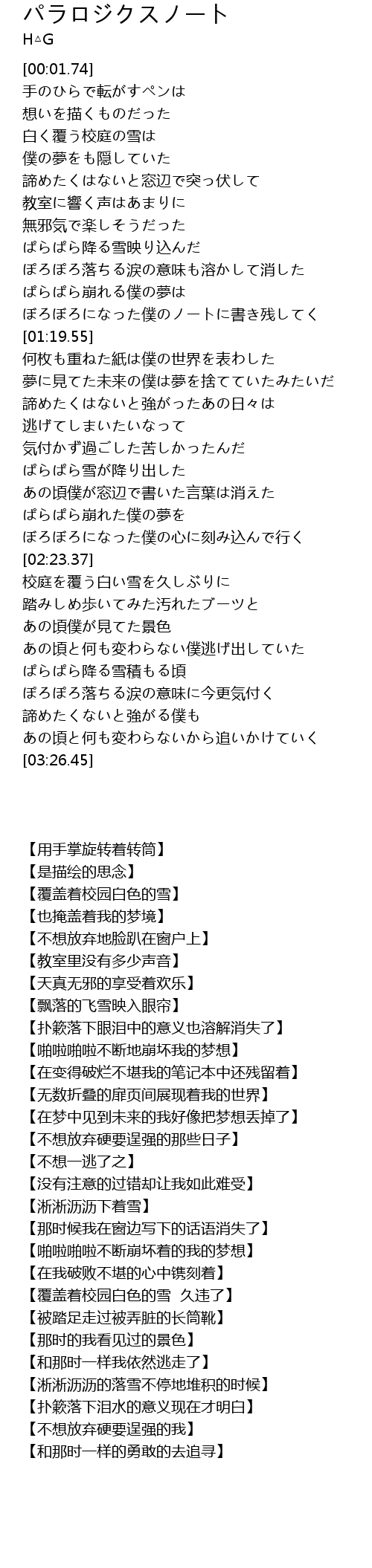 | [01:11.07] | ぼろぼろになった僕のノートに書き残してく |