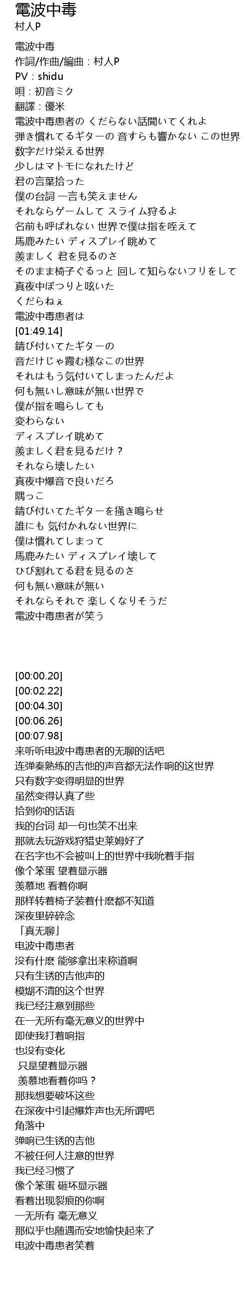 | [00:11.95] | 電波中毒患者の くだらない話聞いてくれよ |