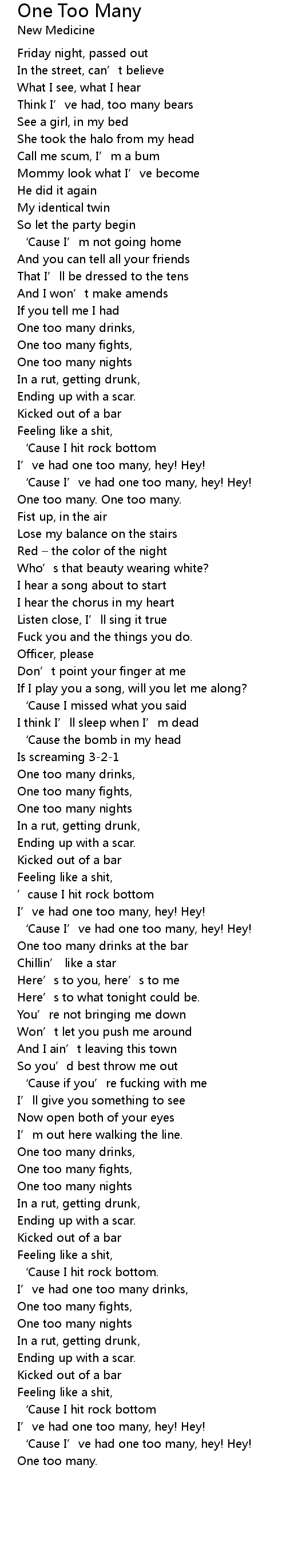 | ‘Cause I’ve had one too many, hey! Hey! | |