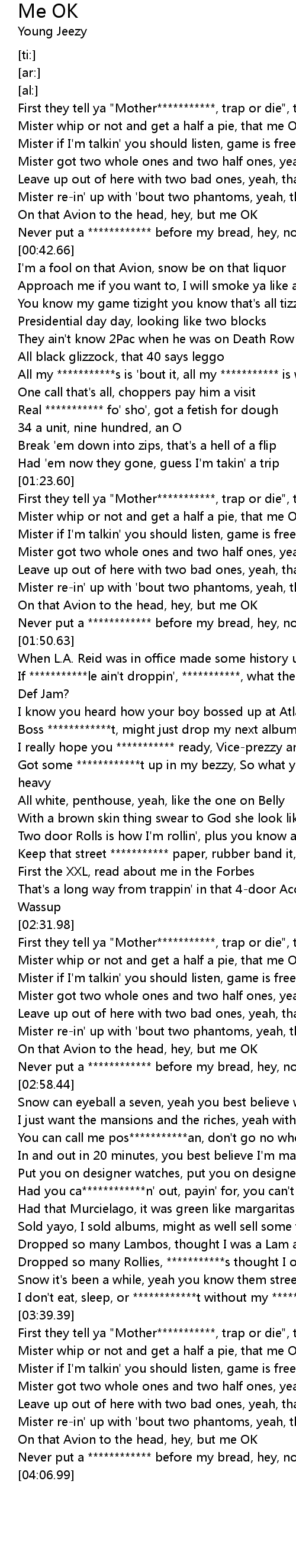 Never put a ************ before my bread, hey, now me OK |