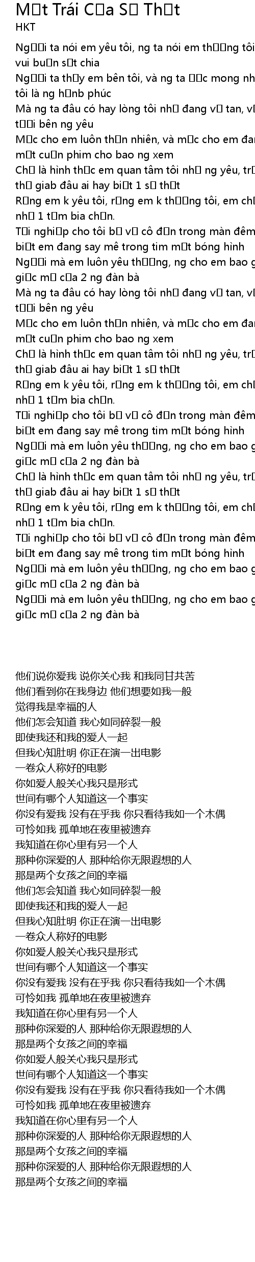 | [03:24.34] | Chỉ là hình thức em quan tâm tôi như ng yêu, trước mắt thế giab đâu ai hay biết 1 sự thật |