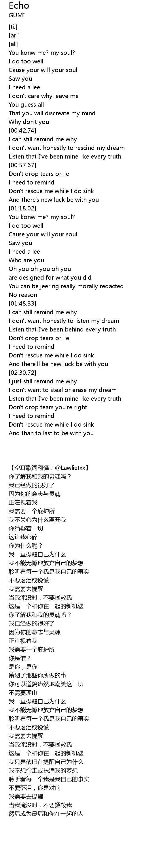 | [01:19.89] | You konw me? my soul? |
