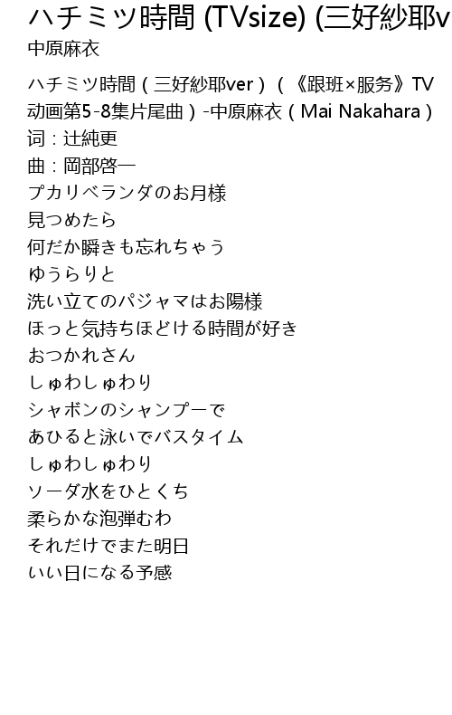 | [00:00.341] | ハチミツ時間(三好紗耶ver)(《跟班×服务》TV 动画第5-8集片尾曲)-中原麻衣(Mai Nakahara) |