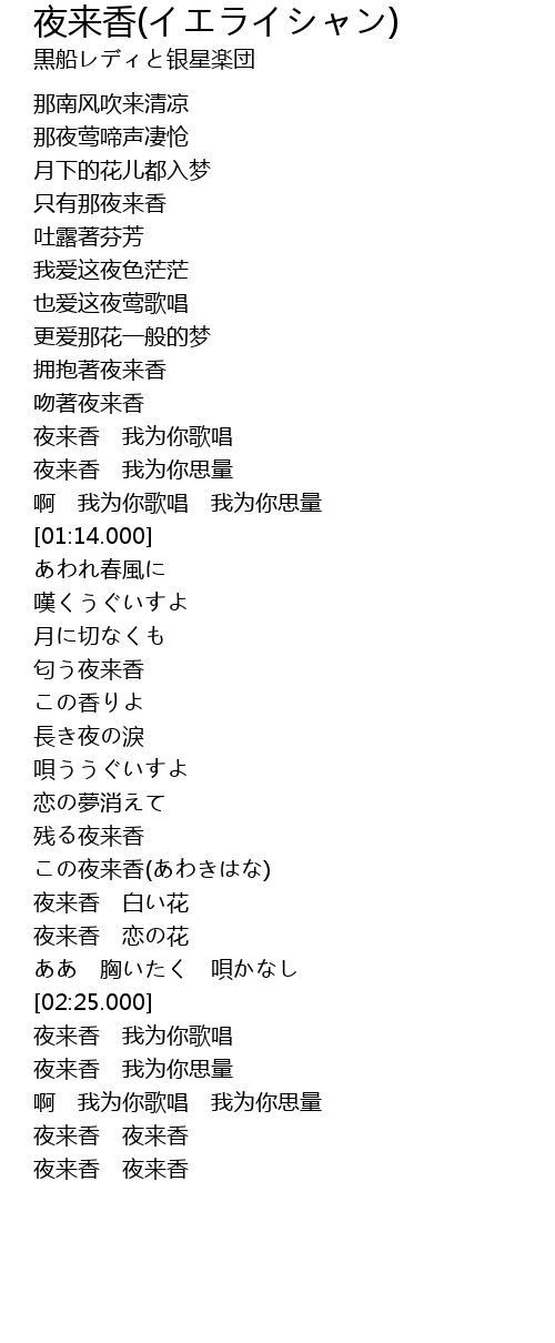 | [01:54.406] | 夜来香 白い花 |