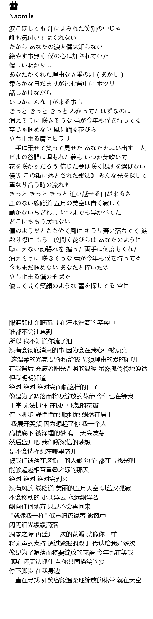 | [05:57.950] | 消えそうに 咲きそうな 蕾が今年も僕を待ってる |