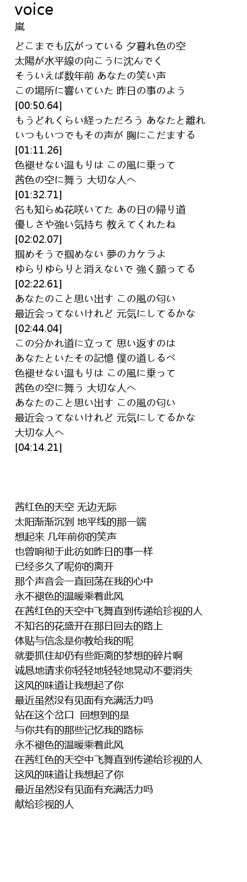 | [01:22.11] | 茜色の空に舞う 大切な人へ |
