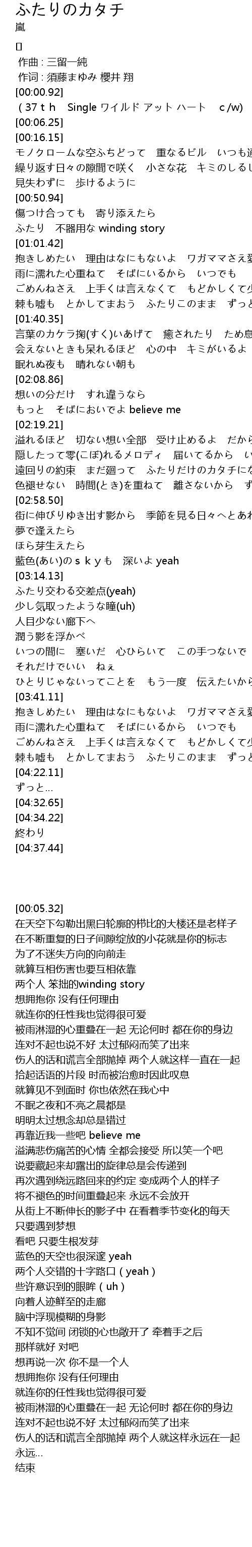 | [02:37.73] | 遠回りの約束 まだ廻って ふたりだけのカタチになれ |
