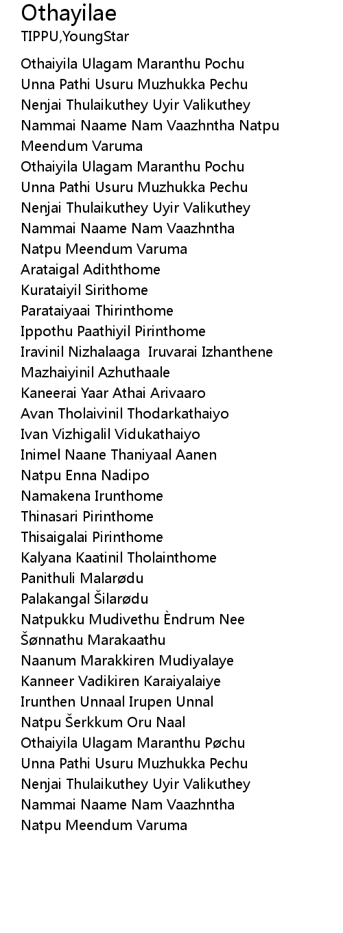 | [03:42.07] | Othaiyila Ulagam Maranthu Pøchu |