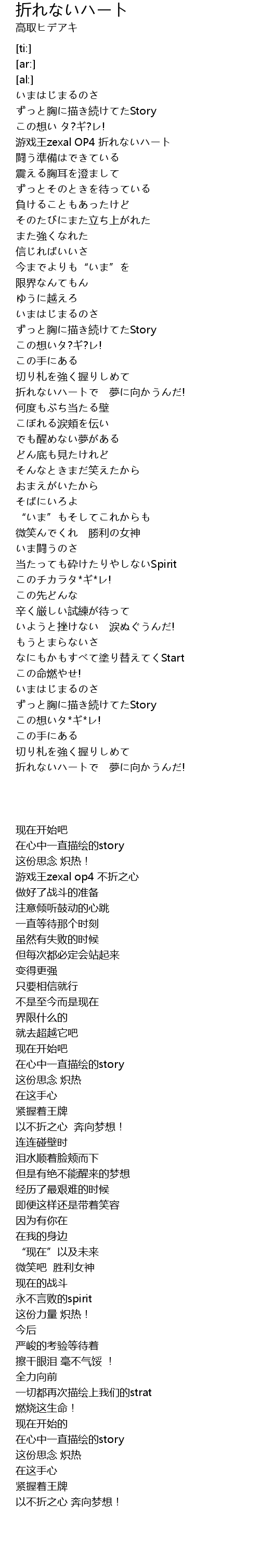 | [00:15.47] | 游戏王zexal OP4 折れないハート |