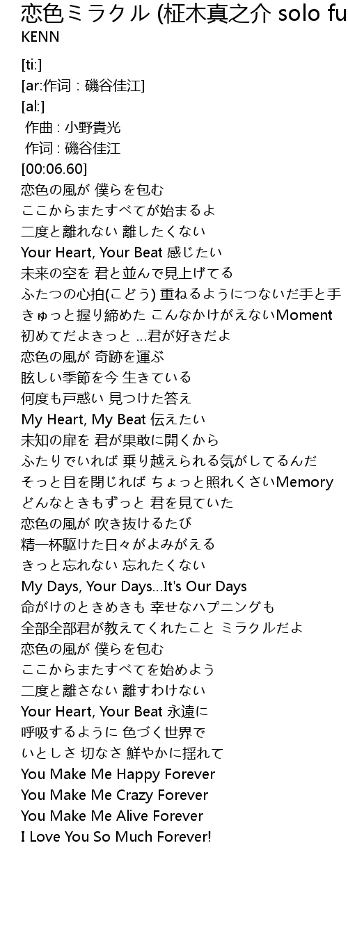 | [00:09.67] | 恋色の風が 僕らを包む |