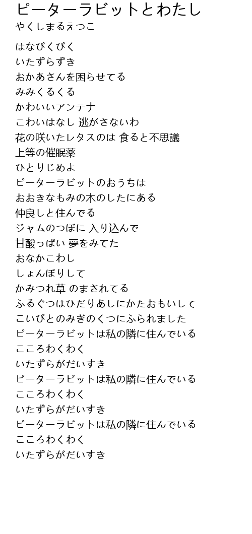 | [02:48.23] | ピーターラビットは私の隣に住んでいる |