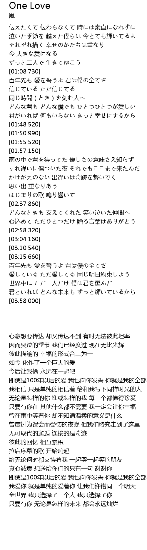 | [03:19.540] | 百年先も 愛を誓うよ 君は僕の全てさ |