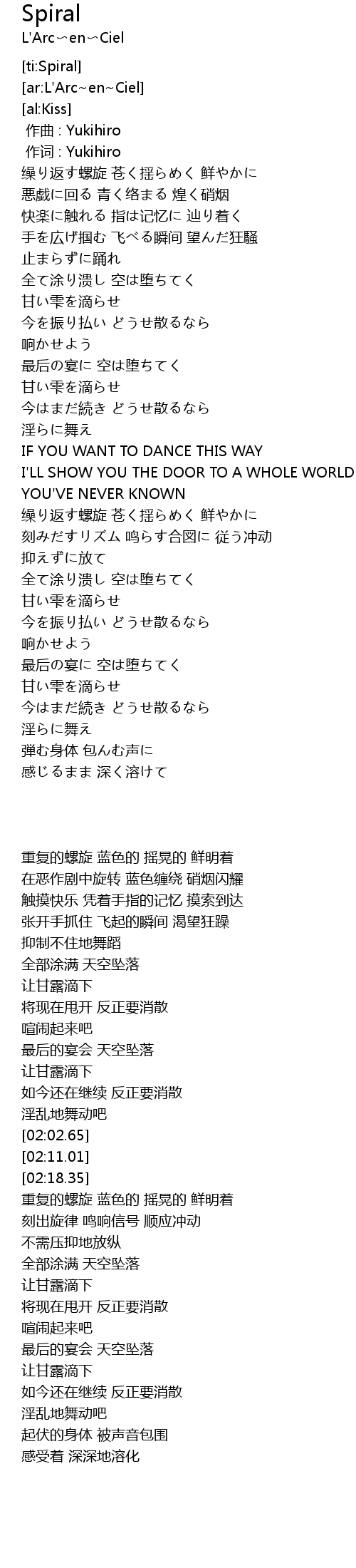 | [02:23.45] | 缲り返す螺旋 苍く揺らめく 鲜やかに |