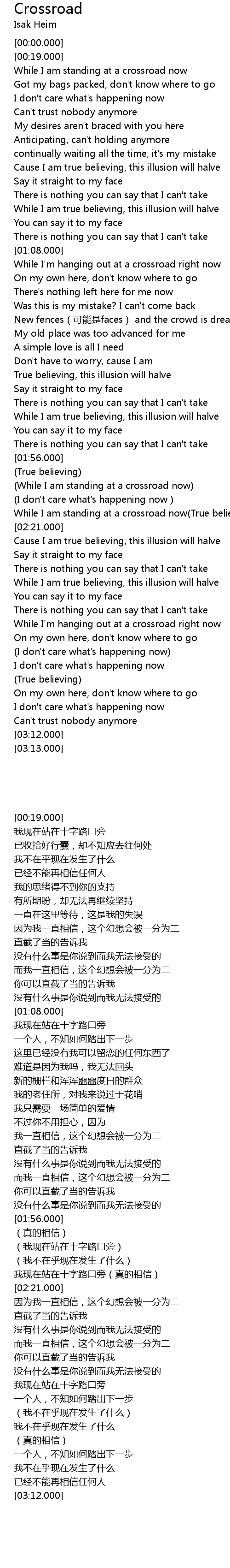| [02:49.000] | While I' m hanging out at a crossroad right now |