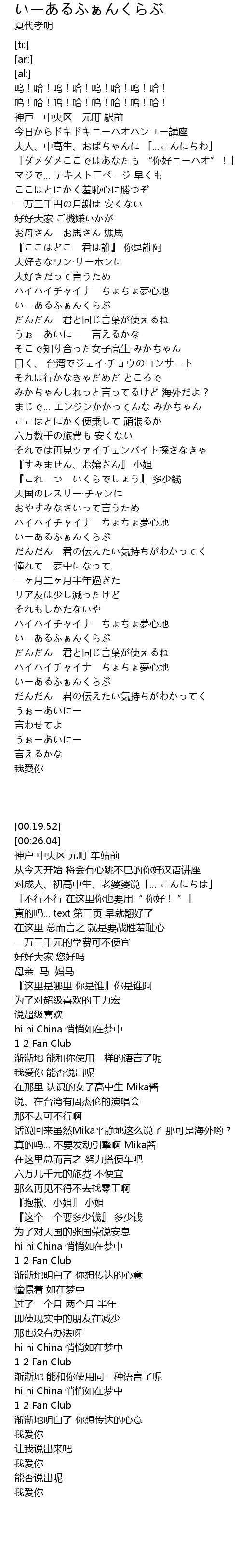 | [00:42.46] | 「ダメダメここではあなたも “你好ニーハオ”!」 |