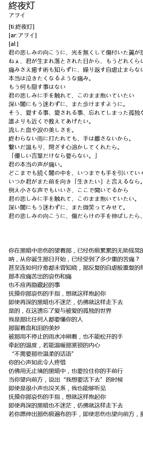 | [03:11.97] | どこまでも続く闇の中を、いつまでも手を引いていくよ。 |