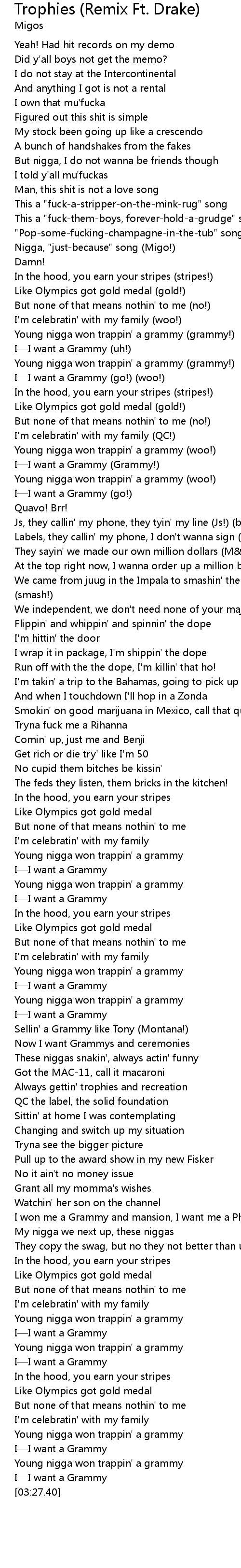 | [01:15.86] | Young nigga won trappin' a grammy (woo!) |