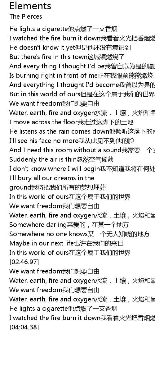 | [03:14.81] | Water, earth, fire and oxygen水流,土壤,火焰和氧气 |