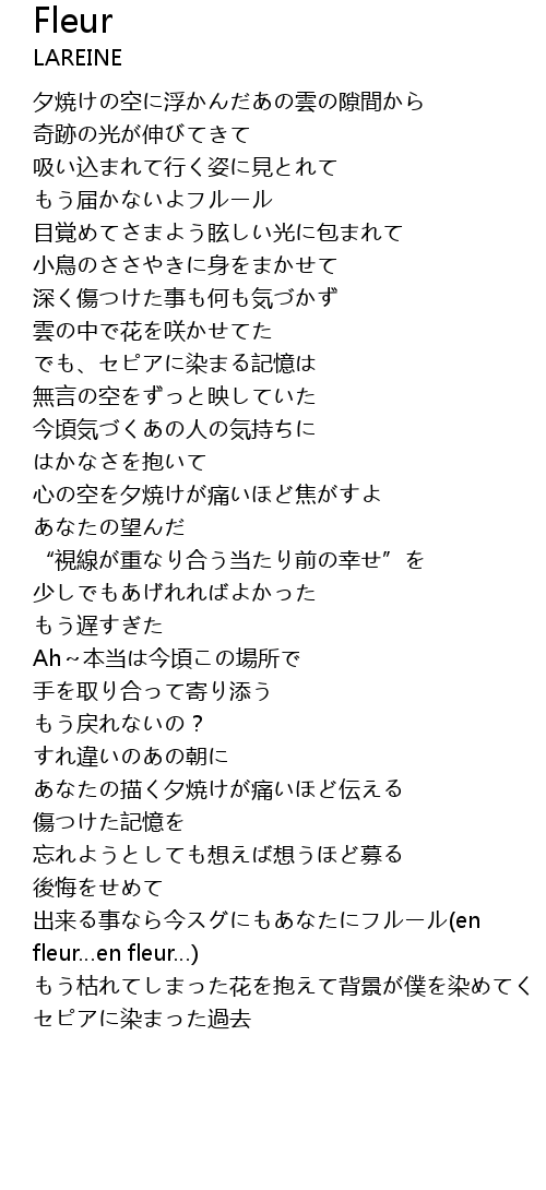 | [03:42.47] | 出来る事なら今スグにもあなたにフルール(en fleur…en fleur…) |