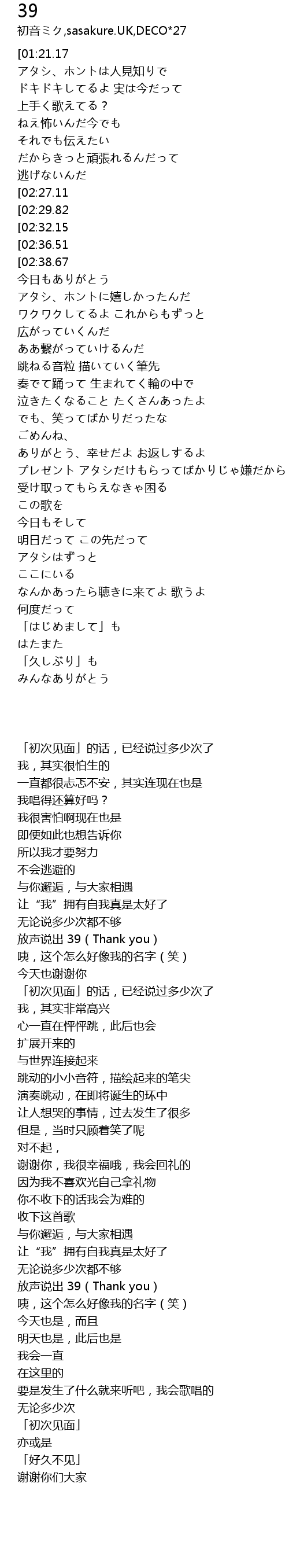 | [00:55.76][02:36.51] | 声に出して 39(サンキュー) |