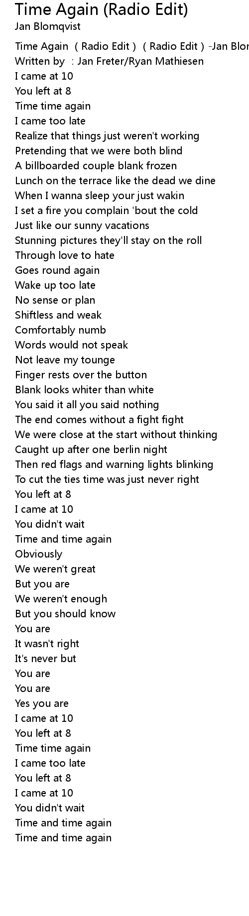 | [00:00.419] | Time Again Radio Edit Radio Edit Jan Blomqvist |