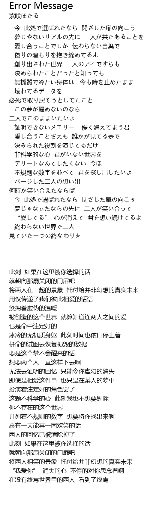 | [04:42.48] | 終わらない世界で二人 見ていたーつの終なわりを |