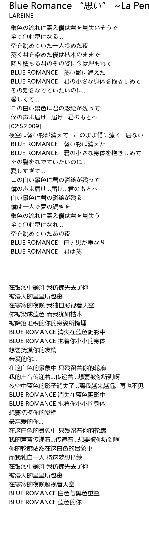 | [02:52.009] | 夜空に葵い影が消えて…このまま僕は遠く…居ない… |