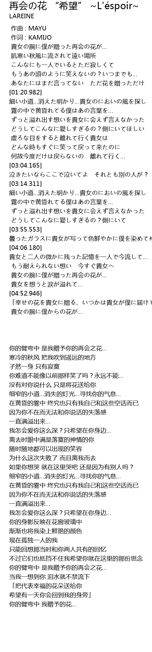 | [04:52.946] | 「幸せの花を貴女に贈る、いつかは貴女が僕に届けて」 |