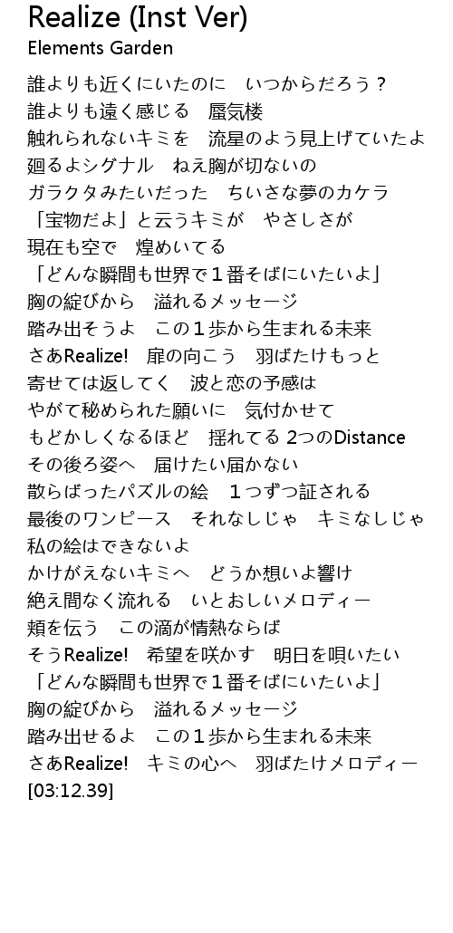 | [03:02.17] | さあRealize! キミの心へ 羽ばたけメロディー |