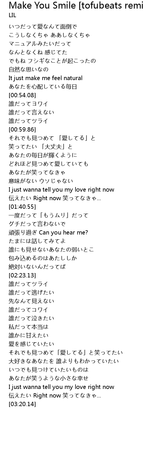 | [01:32.76] | 伝えたい Right now 笑ってなきゃ... |