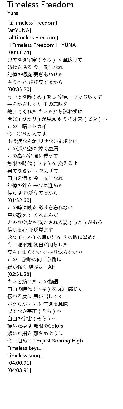 | [00:03.74] | 「Timeless Freedom」-YUNA |