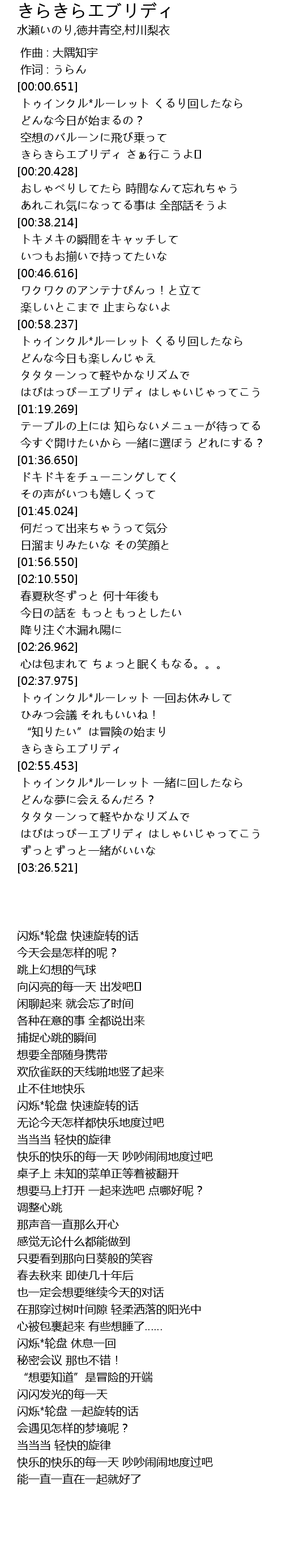 | [00:00.886] | トゥインクル*ルーレット くるり回したなら |
