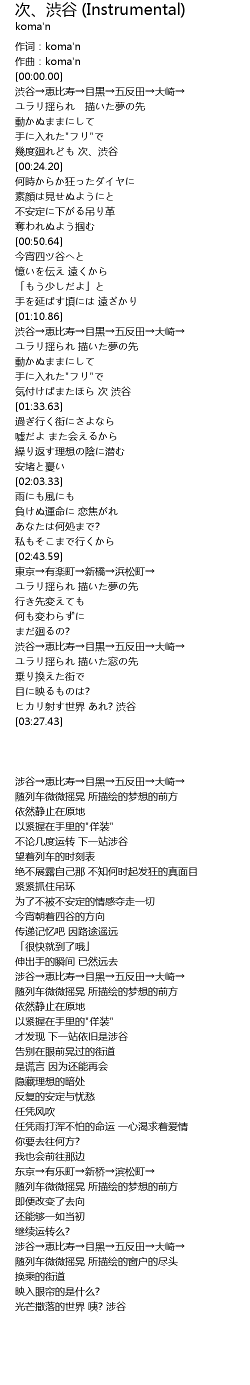 | [00:17.16] | 幾度廻れども 次、渋谷 |