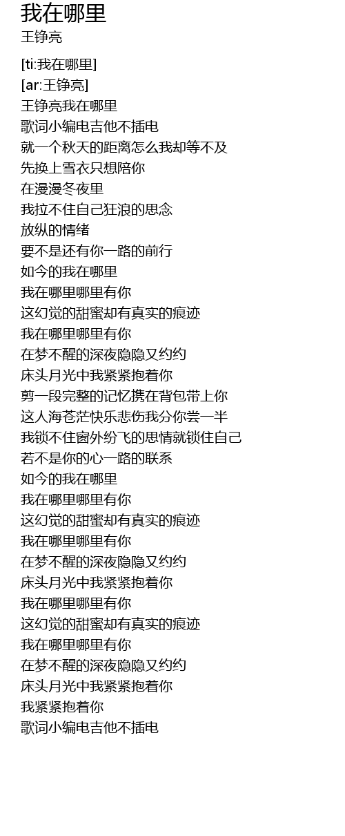 | [00:03.673] | wáng zhēng liàng wǒ zài nǎ lǐ |