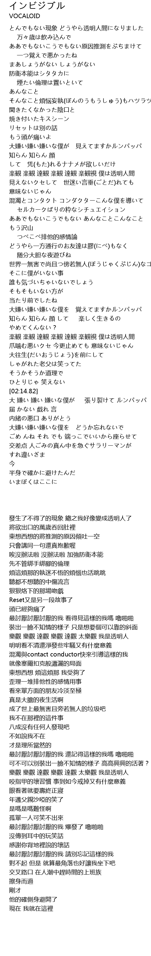 | [01:54.56] | 楽観 楽観 達観 楽観 達観 楽観視 僕は透明人間 |