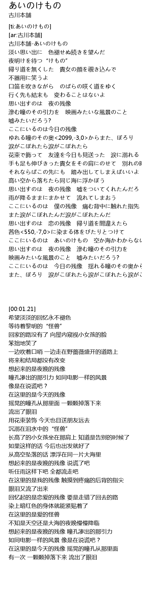 | [00:01.21] | 古川本舗-あいのけもの |