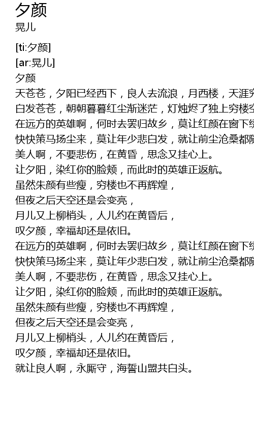 | [02:54.872] | 美人啊,不要悲伤,在黄昏,思念又挂心上。 |