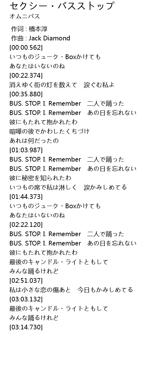 | [01:18.198] | BUS. STOP. I. Remember 二人で踊った |
