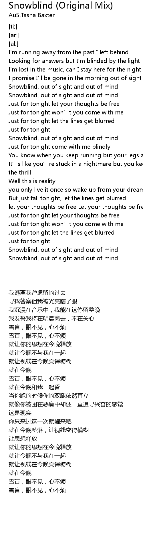 | [04:56.74] | Snowblind, out of sight and out of mind |