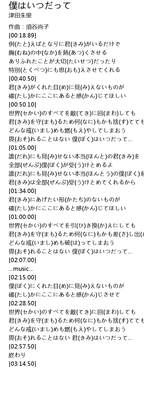 | [02:03.10] | 畏(おそ)れることはない 僕(ぼく)はいつだって… |